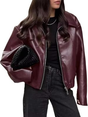 Women Faux PU Leather Jacket Crop Zip Up Motorcycle Coat Long Sleeve Drop Shoulder Motor Bike Jacket Streetwear