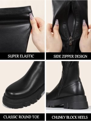 Knee High Boots Women Faux Leather Elastic Boots Low Heel Square Toe Side Zipper Fall Long Tall Boots for Women