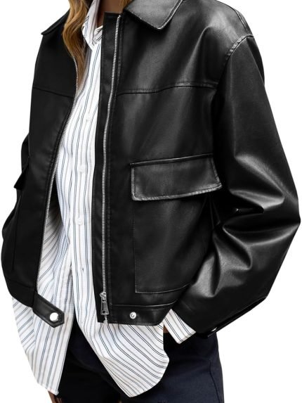 Women Faux Leather Bomber Jackets Zip Up Cropped Lapel Moto Coats Trendy Casual Outerwear with Pockets