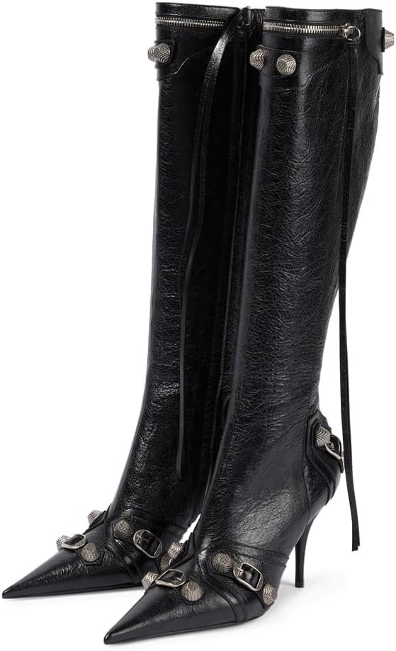 Knee High Boots for Women Fashion Slide Zipper Pointed Toe Stiletto Studded High Heel Rivets Tassel Boots Party Dress Shoes