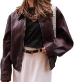 Women Faux Leather Bomber Jackets Zip Up Cropped Lapel Moto Coats Trendy Casual Outerwear with Pockets