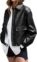 - Features: Cropped oversized faux leather jackets, classic never goes out of style, lapel collar with zipper closure, solid color bomber jackets, perfect for spring and fall.