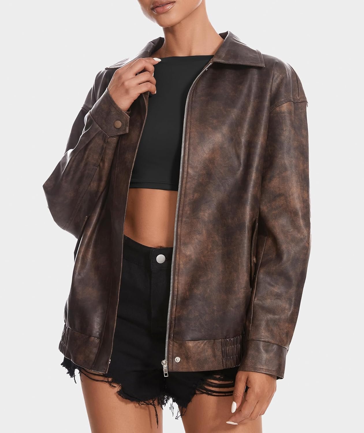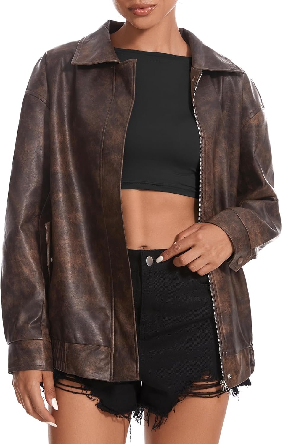 - 【Chic Design】Womens leather jacket features with lapel collar, nice lining, smooth zipper, two deep pockets, elastic hem, and exquisite silhouette. It’s simple, classic, perfectly oversized, effortlessly showing your fashion and charm