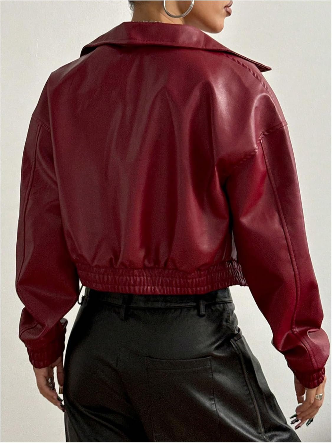 - Features: Faux leather jacket for women, zipper front, long sleeve, drop shoulder, cropped length, solid color, outerwear