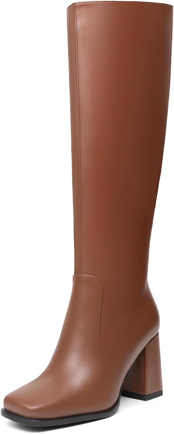 Women Knee High Boots Faux Leather Square To Tall Boots Fashion Chunky Block Heel Long Boots with Side Zip